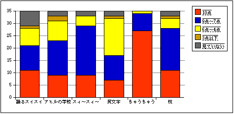 質問2 今までに放送されたキンチョウリキッドのCMに点数を付けてください。 CMタイトル 合計得点 最高得点 最低得点 平均得点 覚えていない・ 1位 99年/ちゃう! ちゃう! 篇 334点 10点 5点 9.54点 0 2位 98年/スィ〜スィ〜篇 267点 10点 4点 8.09点 2 3位 99年/杭篇 266点 10点 1点 8.06点 2 4位 97年/アヒルの学校篇 247点 10点 1点 7.48点 2 5位 98年/尻文字篇 233点 10点 3点 7.28点 3 6位 97年/踊るスイスイ篇 231点 10点 3点 7.96点 6 ※ちゃう! ちゃう!